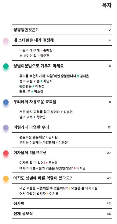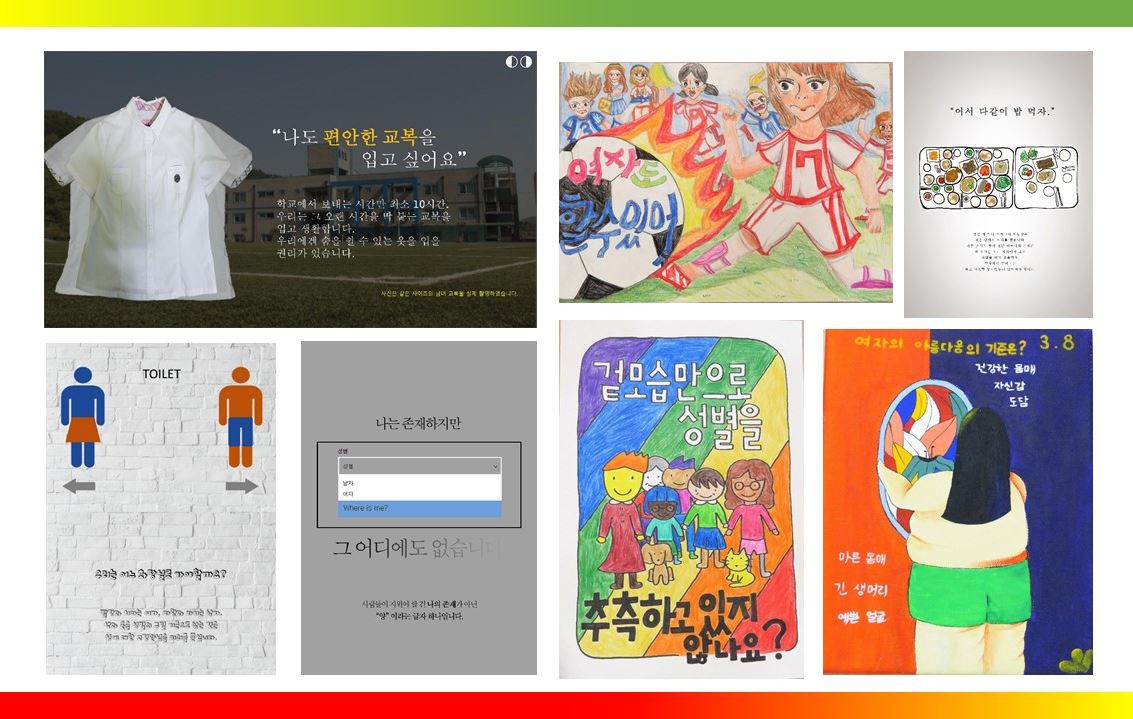 아하!서울시립청소년성문화센터(이하 아하!센터)에서는 2017년도, 2018년도 성평등한컷 공모전 출전작을 엮은 ‘성평등한컷 공모전’ 작품집을 2018년 12월 발간했다. 2년간의 수상 작품들을 주제별로 묶어, 현재 청소년이 성평등과 관련하여 중요하게 생각하는 의제가 무엇인지 가시화하고 교육자료로 활용할 수 있도록 한 것이다.