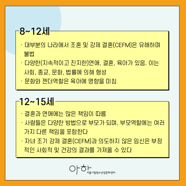 -이 카드뉴스 시리즈는 ‘UN 포괄적 성교육 국제적 지침’에 따라 8가지 주요 핵심 개념을 4개의 연령 집단(으로5-8세, 9-12세, 12-15세, 15-18세 이상) 구분하여 제시합니다.