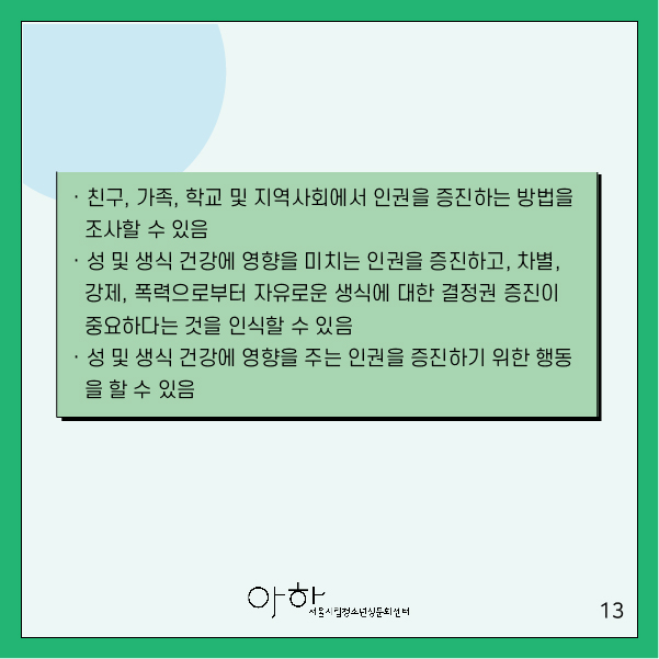 ▶성 및 생식 건강에 영향을 주는 인권을 증진하기 위한 행동을 할 수 있다.
