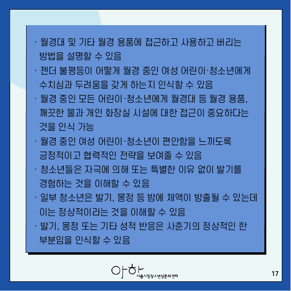 · 신뢰할 수 있는 어른을 찾아 성 및 생식 구조와 월경에 대해