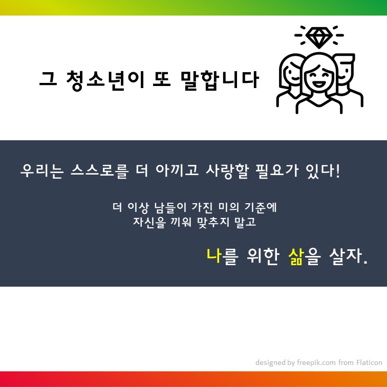 그 청소년이 또 말합니다. 우리는 스스로를 더 아끼고 사랑할 필요가 있다! 더 이상 남들이 가진 미의 기준에 자신을 끼워 맞추지 말고 나를 위한 삶을 살자.