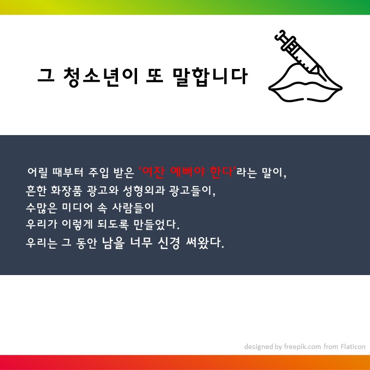 어릴 때부터 주입 받은 '여잔 예뻐야 한다'라는 말이, 흔한 화장품 광고와 성형외과 광고들이, 수많은 미디어 속 사람들이 우리가 이렇게 되도록 만들었다. 우리는 그동안 남을 너무 신경 써왔다.