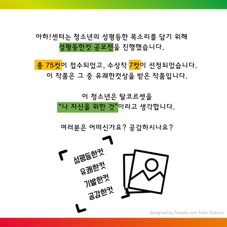 아하!센터는 청소년의 성평등한 목소리를 담기 위해 성평등한컷 공모전을 진행했습니다.