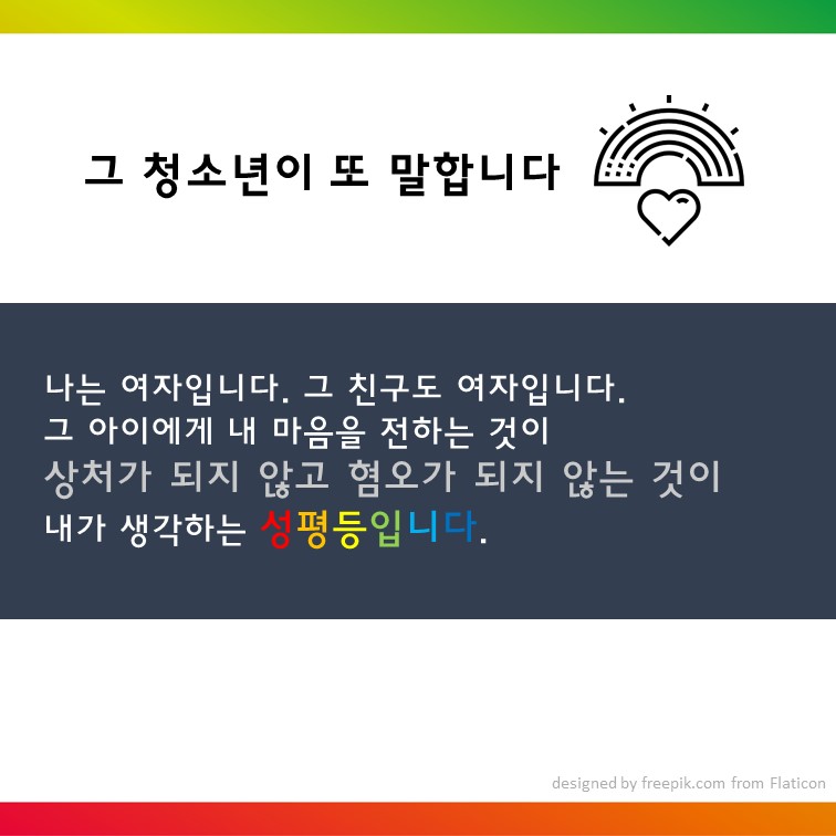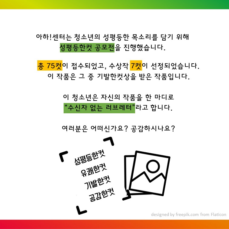 아하!센터는 청소년의 성평등한 목소리를 담기 위해 성평등한컷 공모전을 진행했습니다.