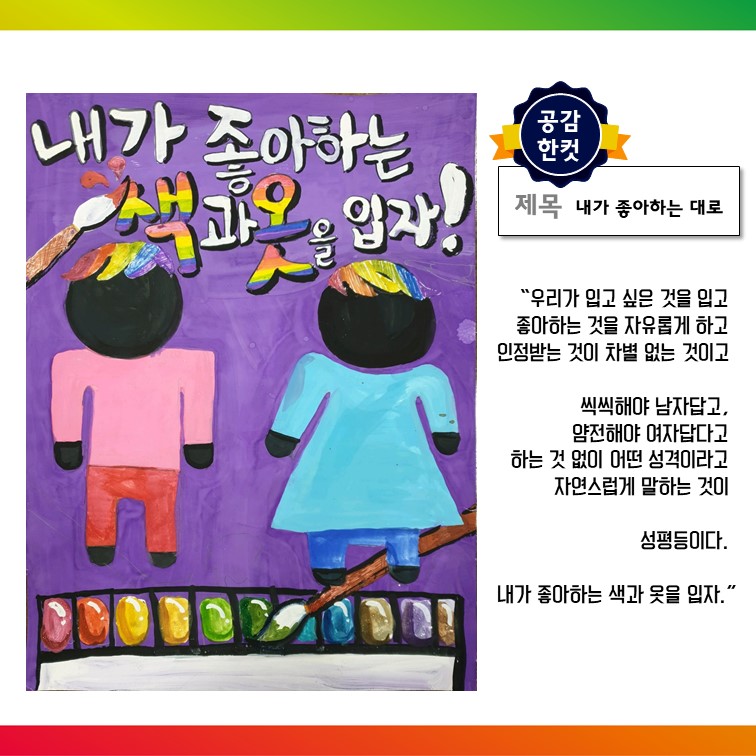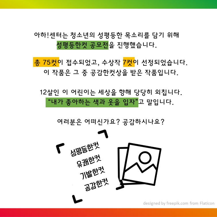 아하!센터는 청소년의 성평등한 목소리를 담기 위해 성평등한컷 공모전을 진행했습니다.