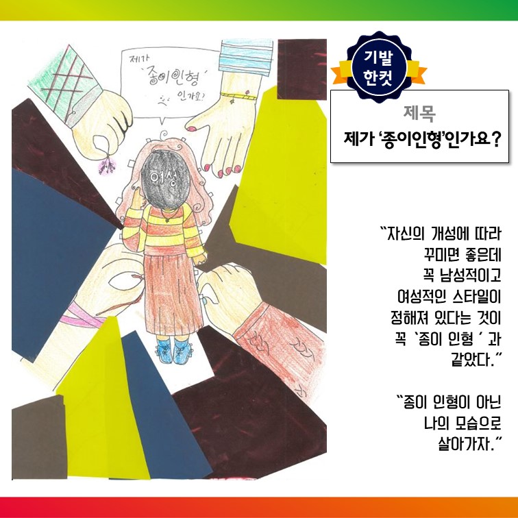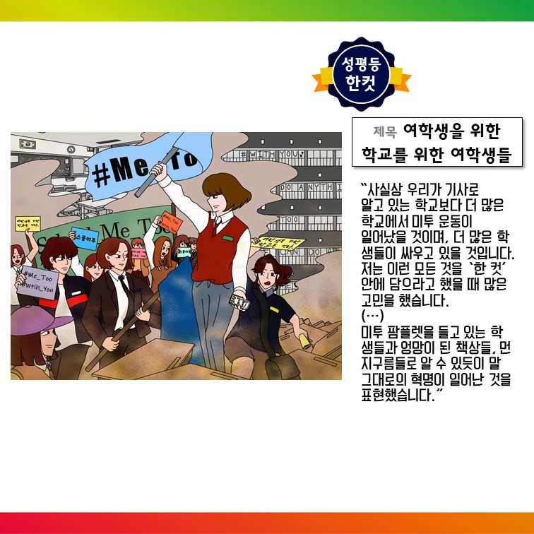 아래는 치열한 심사과정을 거쳐 2019 성평등한컷 공모전 수상작으로 선정된 7컷과 작가의 설명이다.