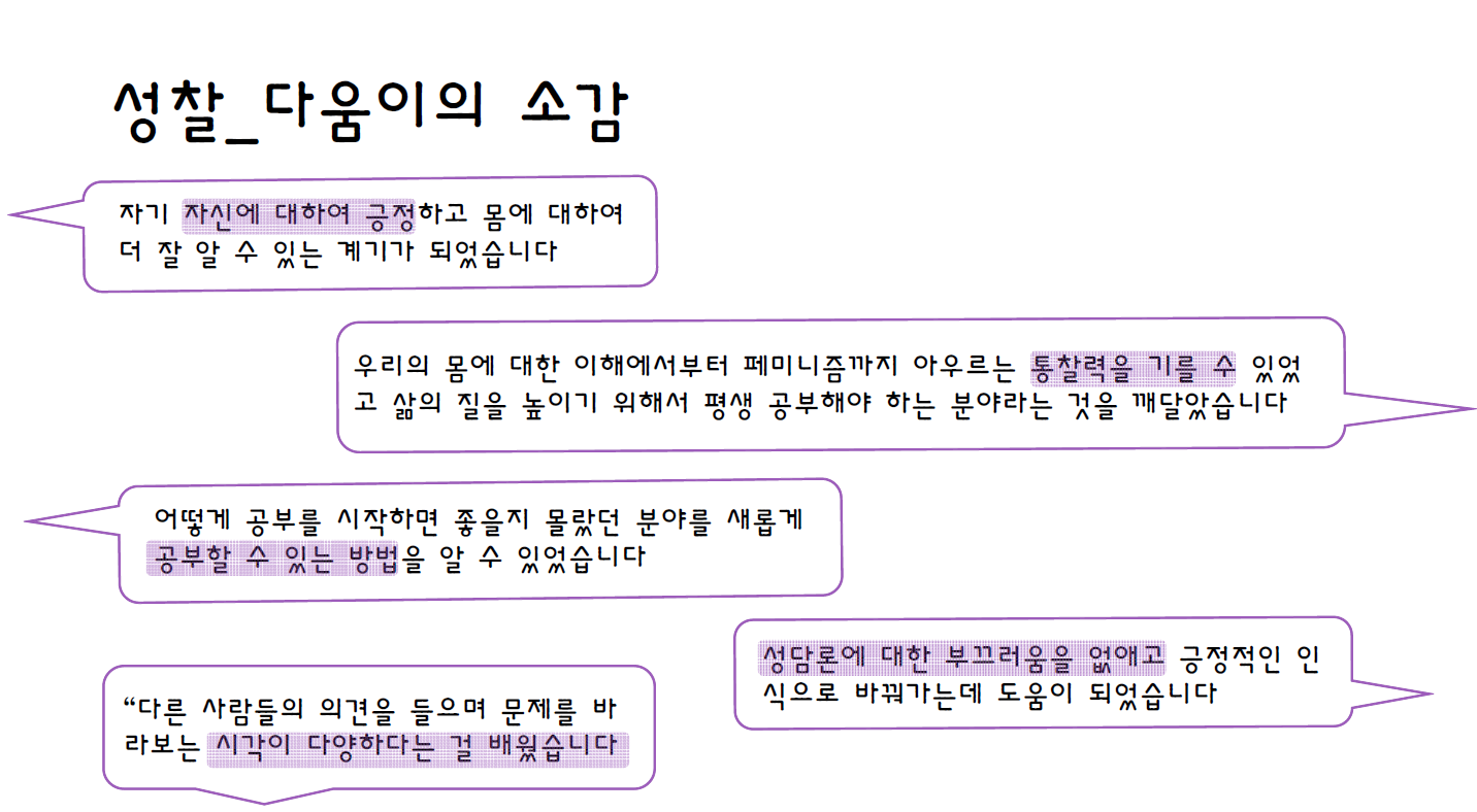 다움이 1기는 교육의 필요성을 느낀 청년이 직접 담론의 장을 마련했다는데 큰 의의가 있다. 다움이는 성담론 인플루엔서로서, 개인 SNS에 성담론 카드뉴스 혹은 게시물을 작성하기도 했다. 인플루엔서 역할을 하는 7주 간의 기간 동안 다움이들은 스스로 성장했으며, 우리 사회에서 성담론의 필요성에 대해 이야기하는 소중한 발걸음을 내디뎠다.