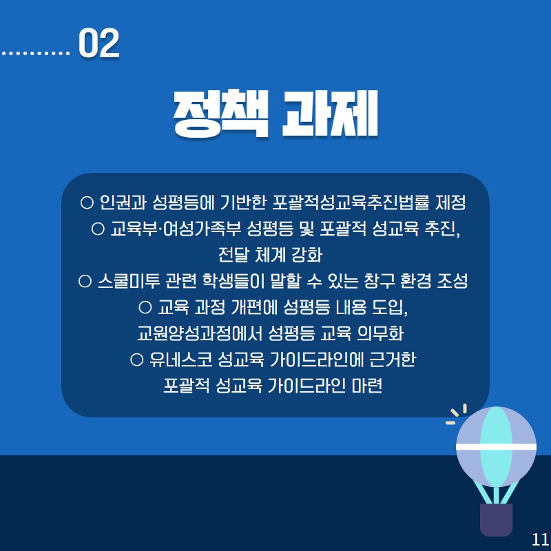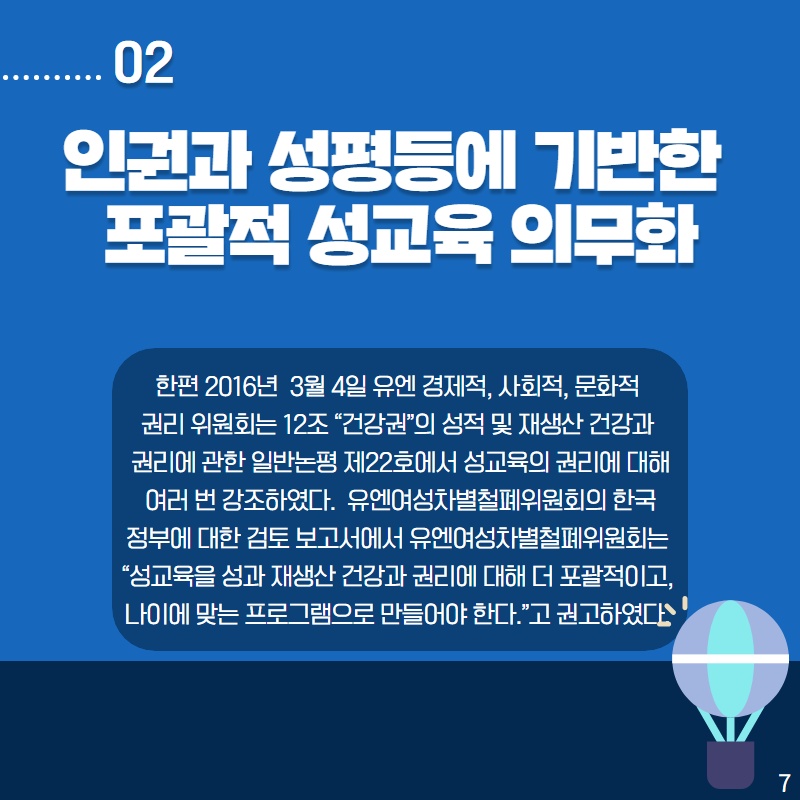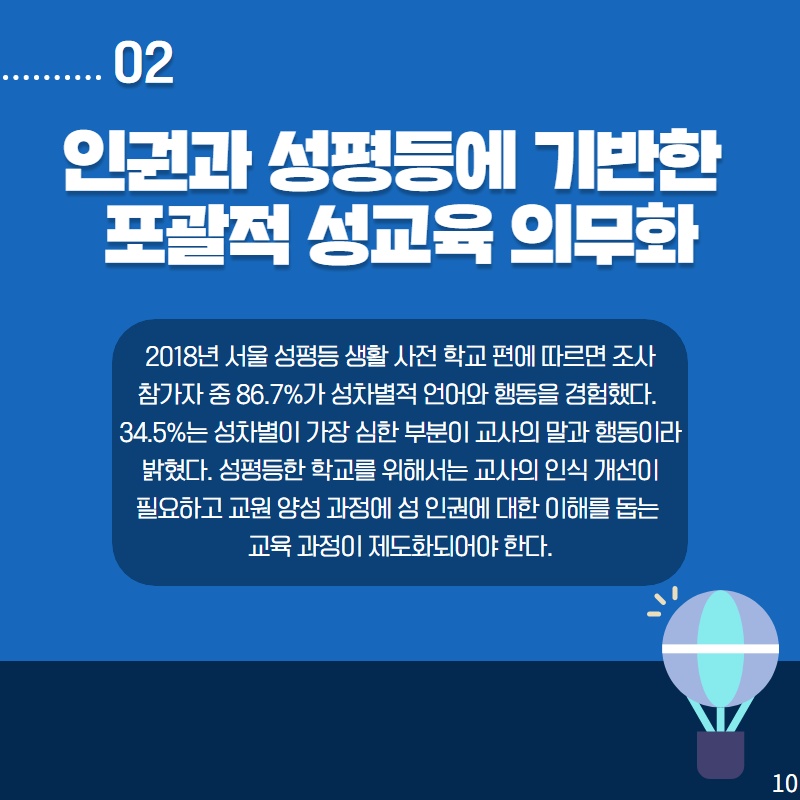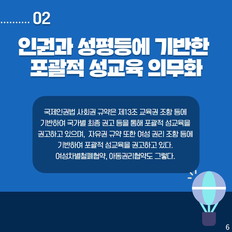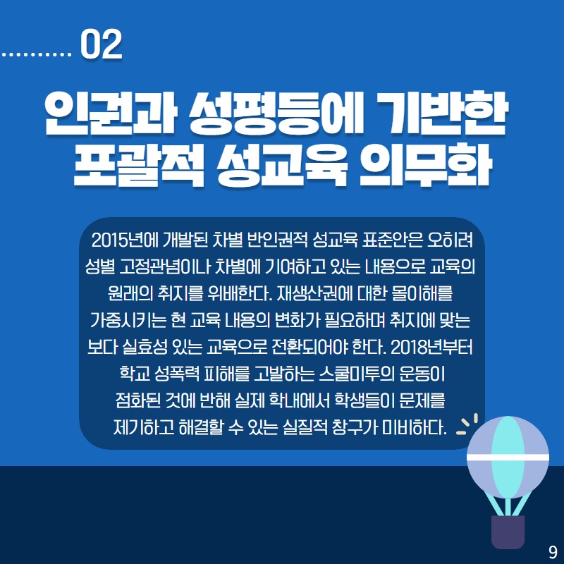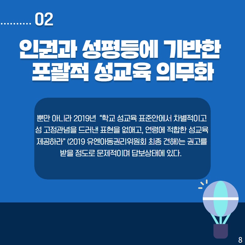 인권과 성평등에 기반한 포괄적 성교육 의무화(풍선이 그려진 파란색 배경)