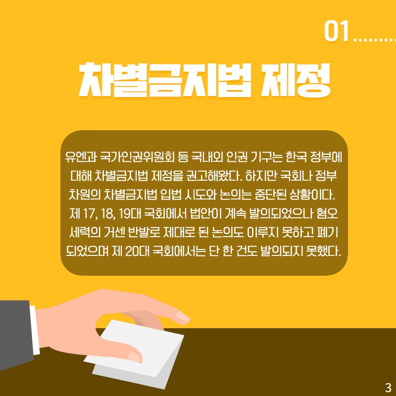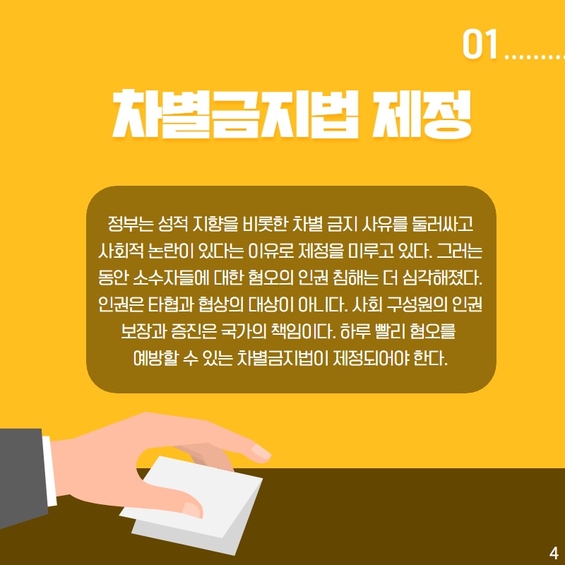 차별금지법 제정(투표용지를 넣는 손이 그려진 노란색 배경)