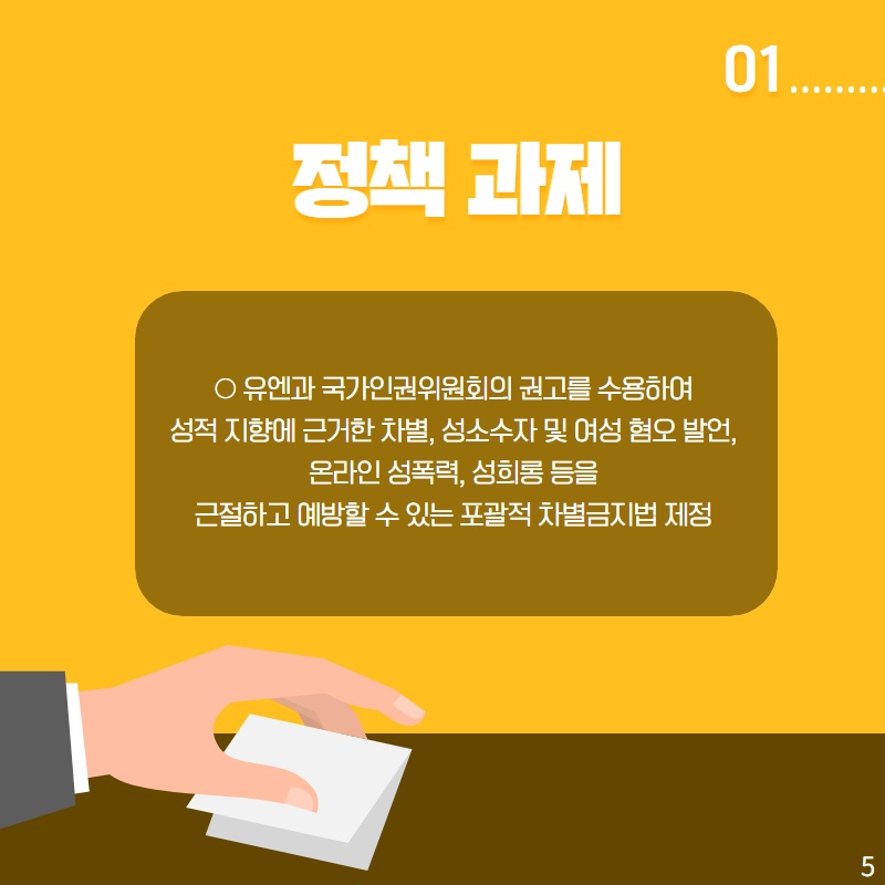 ○ 유엔과 국가인권위원회의 권고를 수용하여 성적지향에 근거한 차별, 성소수자 및 여성혐오 발언 온라인 성폭력, 성희롱 등을 근절하고 예방할 수 있는 포괄적 차별금지법 제정