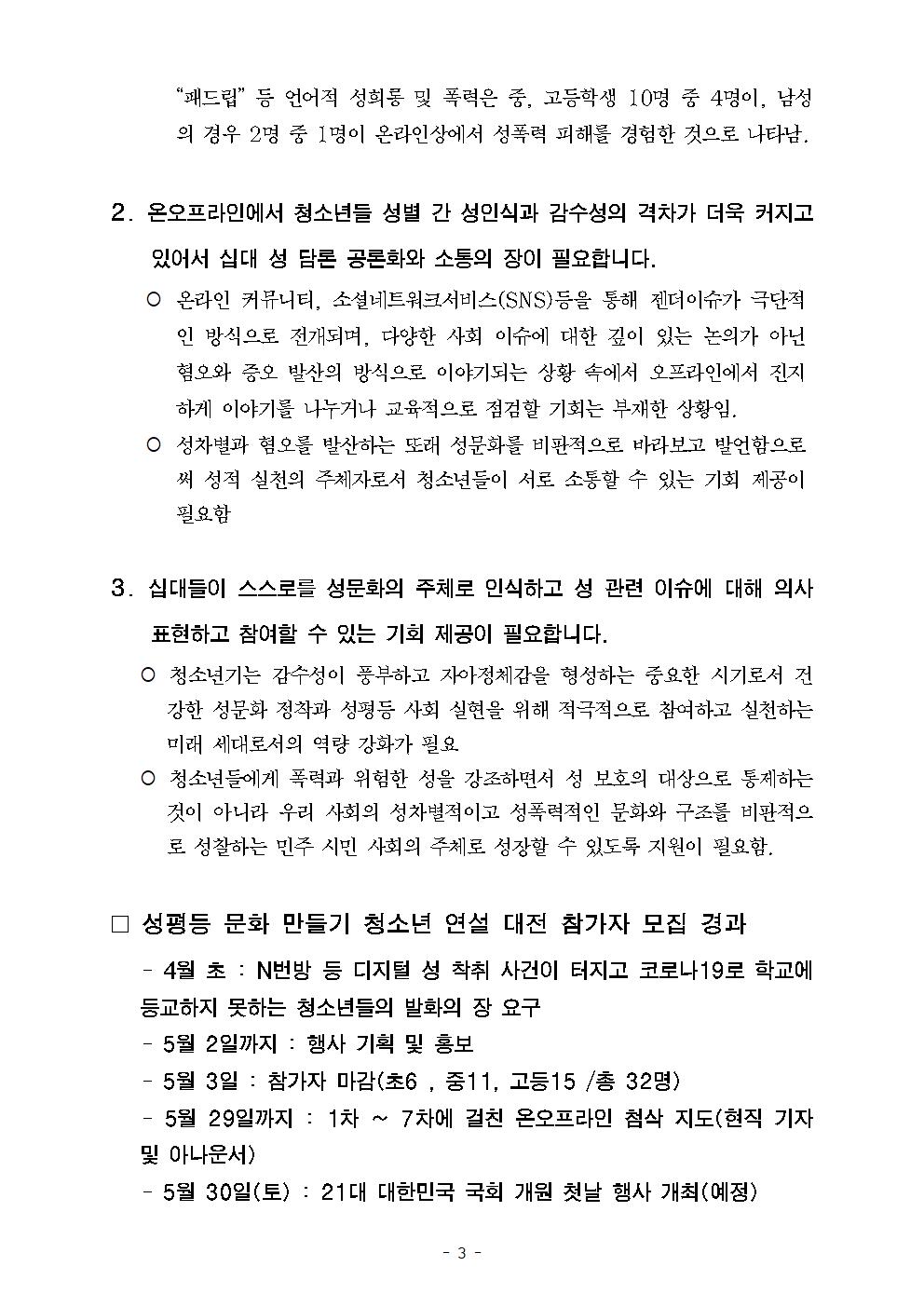 □ 성평등 문화 만들기, 청소년 연설 대전 취지