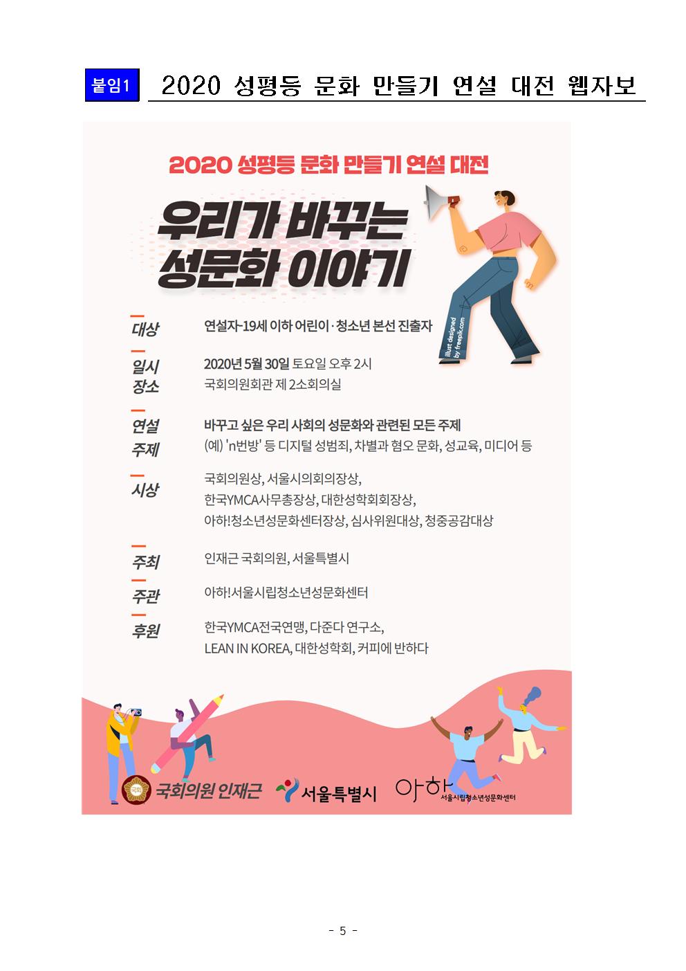 | 2020 성평등 문화 만들기 연설 대전 일정이 변경되었습니다. (0) | 2020.05.18 |
