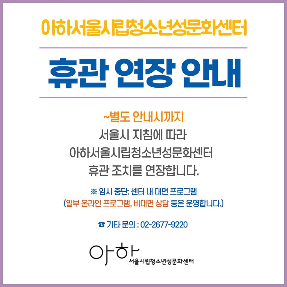 6월12일 중앙재난안전대책본부가 발표한 수도권 방역강화 연장 조치에 따라, 아하!서울시립청소년성문화센터의 휴관 조치를 연장합니다.