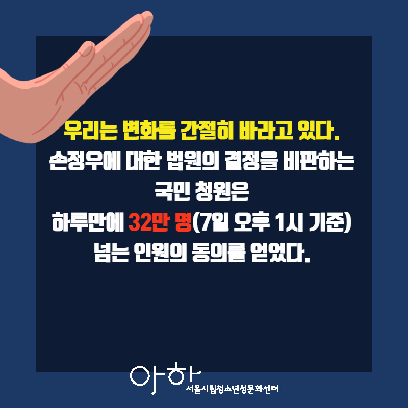 7. 우리는 변화를 간절히 바라고 있다. 손정우에 대한 법원의 결정을 비판하는 국민 청원은 하루만에 32만 명(7일 오후 1시 기준) 넘는 인원의 동의를 얻었다. 인권과 성평등 교육을 실천하는 아하!센터는 어린이 청소년뿐 아니라 이들 주변의 비청소년들이 이 사건을 성평등 교육의 텍스트로 삼아 왜 이런 판결이 나왔는지 파고 또 파고 질문하며 무엇이 잘못된 것이지를 배울 것이다. 앞으로는 다시 이런 판결이 허용되는 사회를 만들지 않겠다. 더 이상 우리 대한민국이 디지털성착취범들이 살기 좋은 나라로 내버려 두지 않겠다. 손정우는 미국으로 인도해야 마땅했다.