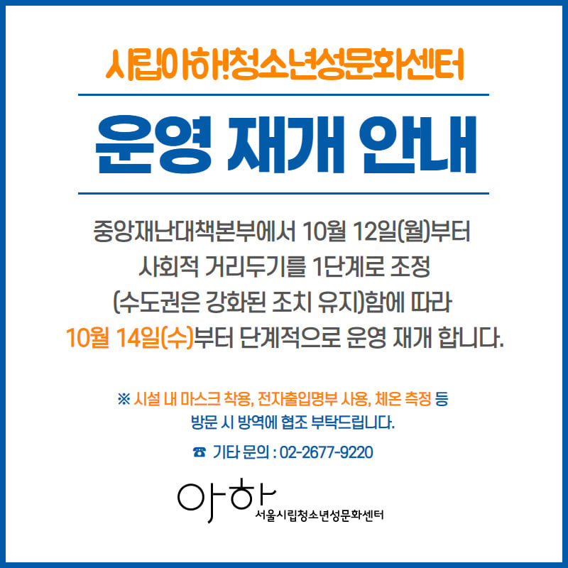 중앙재난대책본부에서 10월 12일(월)부터 사회적 거리두기를 1단계로 조정(수도권은 강화된 조치 유지)함에 따라 10월 14일(수)부터 운영을 단계별로 재개하오니 일정에 참고해주시기 바랍니다.