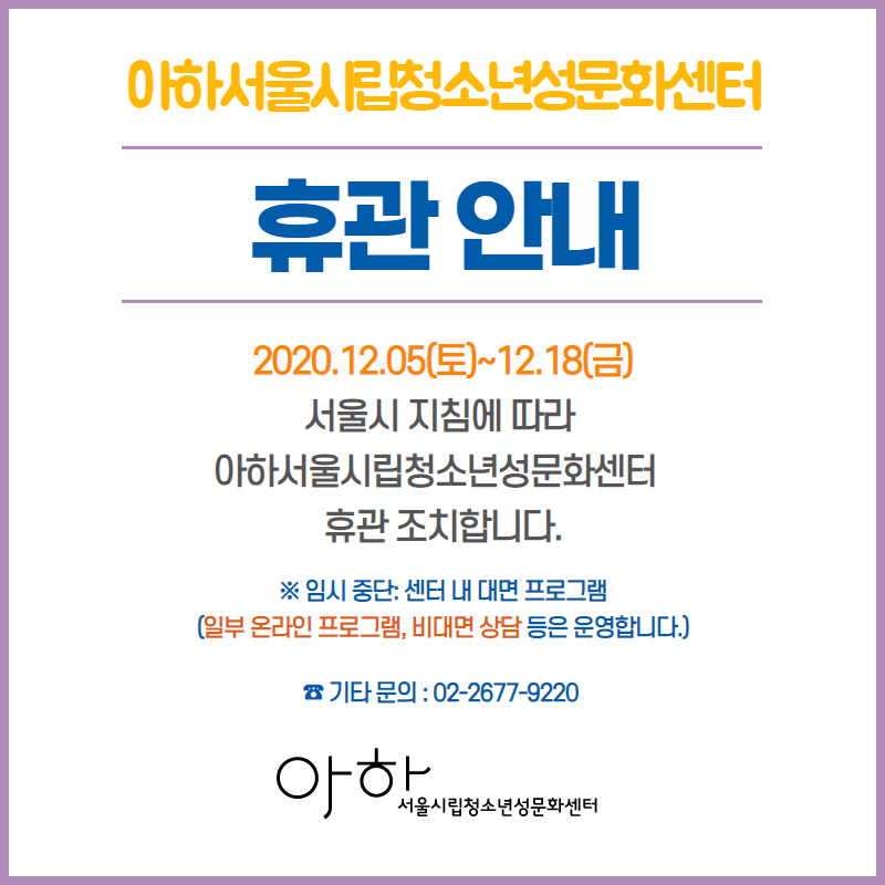 아하!센터의 온라인 비대면 상담과 온라인 비대면 강의 등은 지속 운영되오니 참고 부탁드립니다.