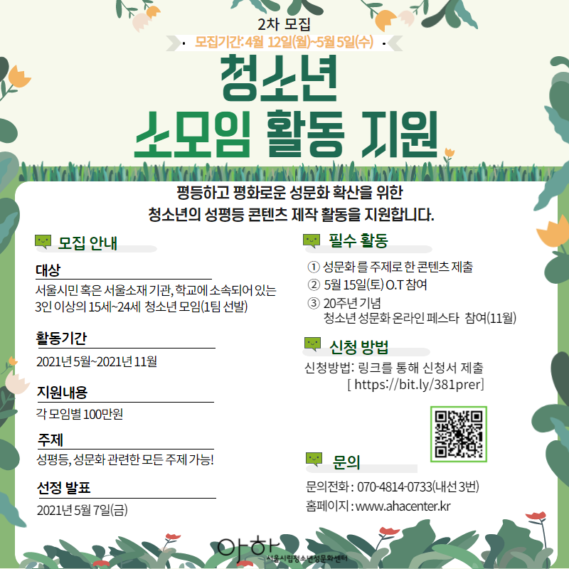 아하!센터는 청소년의 주체적인 성문화활동을 지원하고 평등하고 평화로운 성문화를 만들고자 청소년 소모임 활동을 지원합니다.