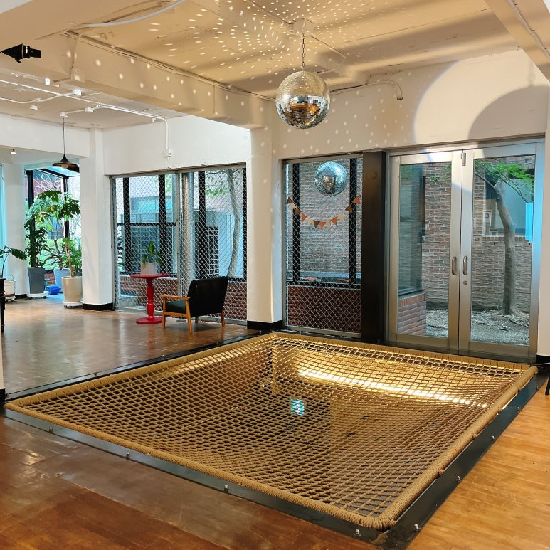 그물존은 1층 로비와 지하 강당 사이 벽을 허물어서 만들었어요.